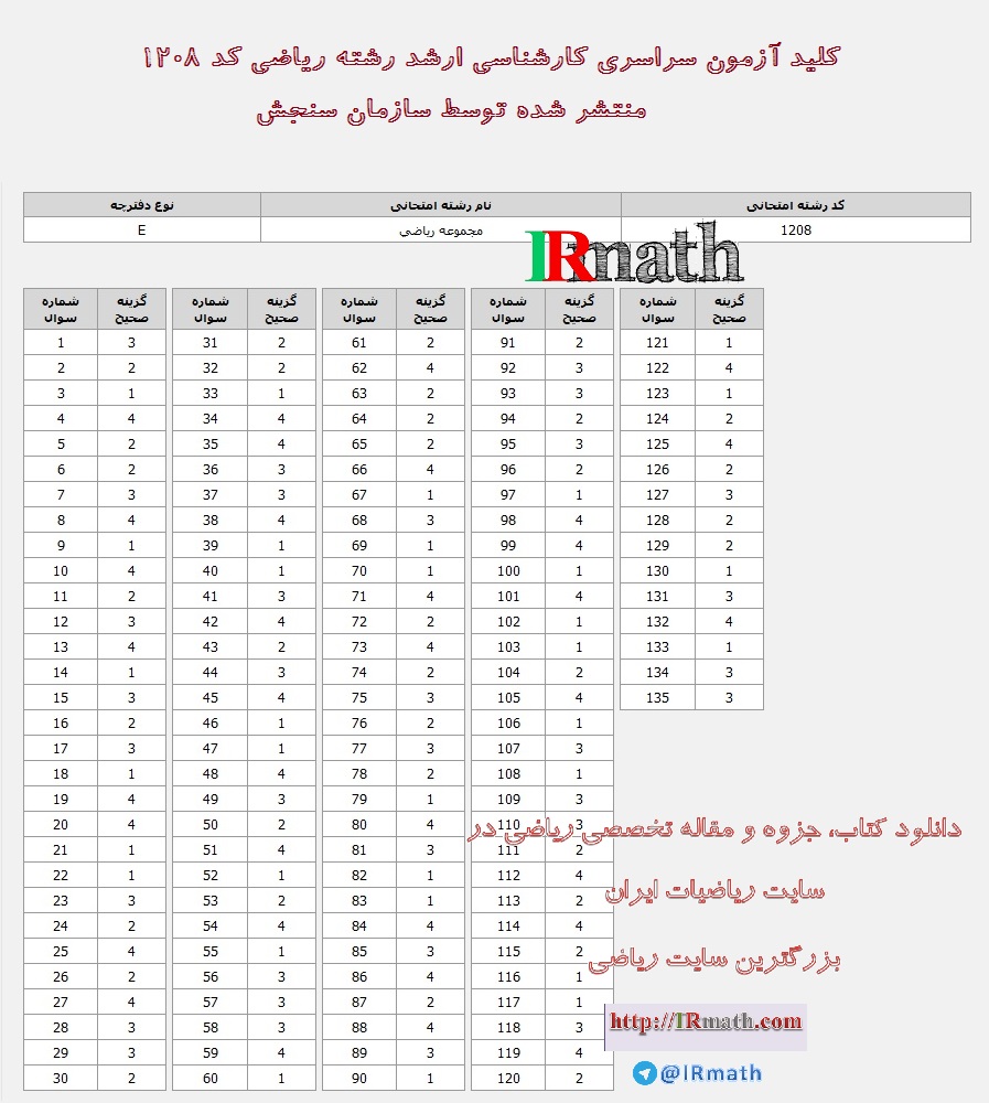 دانلود کلید سوالات کنکور سراسری کارشناسی ارشد رشته ریاضی کد 1208 سال 95 منتشر شده توسط سازمان سنجش
