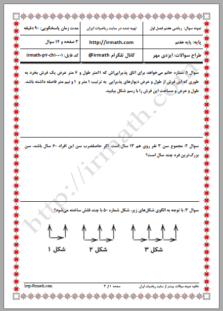 فایل ورد نمونه سوال ریاضی پایه هفتم فصل اول شماره ۱