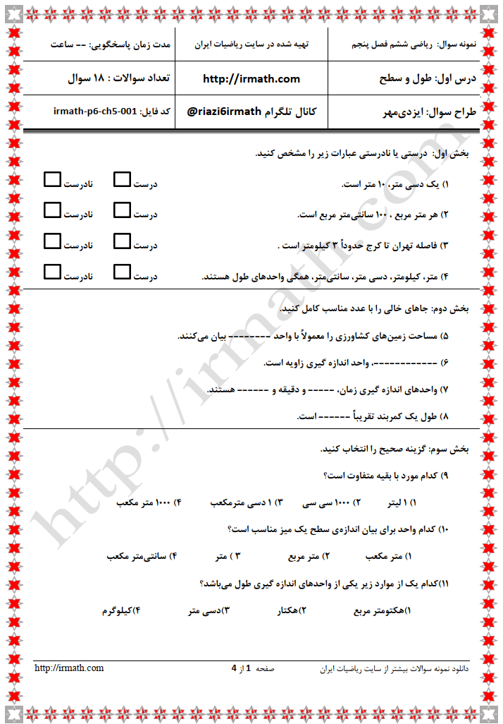 این فایل در ۳ صفحه تهیه شده است و شامل ۱۸ سوال متنوع در درس اول از فصل پنجم ریاضی پایه ششم ابتدایی است.