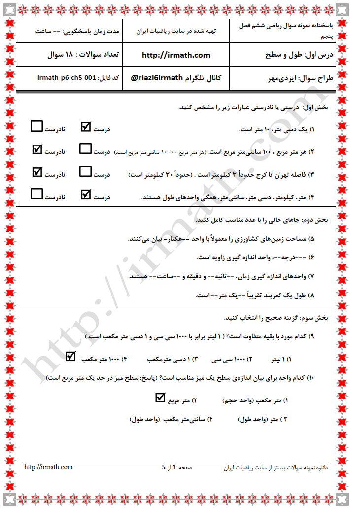 این فایل پاسخ  سوال ریاضی پایه ششم فصل پنجم درس اول طول و سطح- شماره ۱ است.