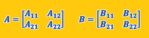 قضیه ۱. فرض کنید که A و B دو ماتریس هم مرتبه باشند. برای این دو ماتریس، بلوکبندی را به گونه زیر انجام میدهیم که ضرب AB قابل تعریف باشد.