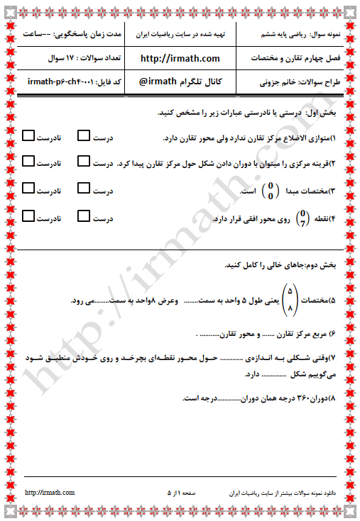 نمونه سوالات ریاضی پایه ششم فصل چهارم