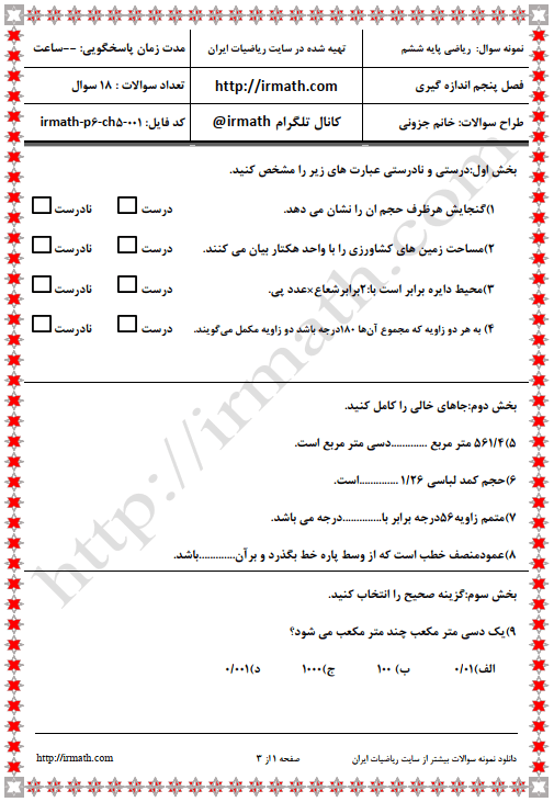 نمونه سوالات ریاضی پایه ششم فصل پنجم