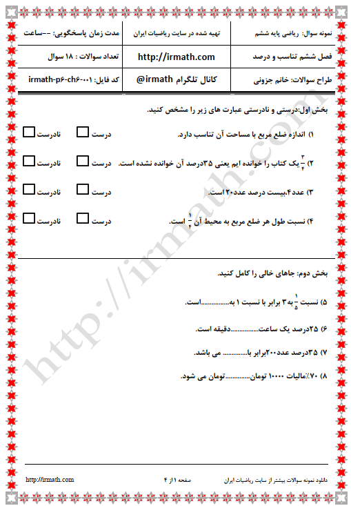 نمونه سوالات ریاضی پایه ششم فصل ششم تناسب و درصد