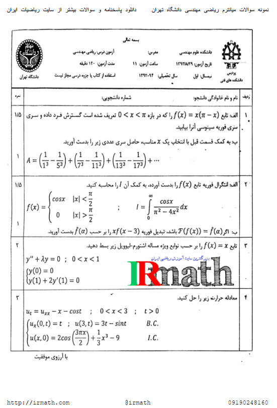فایل پاسخ تشریحی میانترم ریاضی مهندسی دانشگاه تهران ۱۳۹۳۰۸۲۹