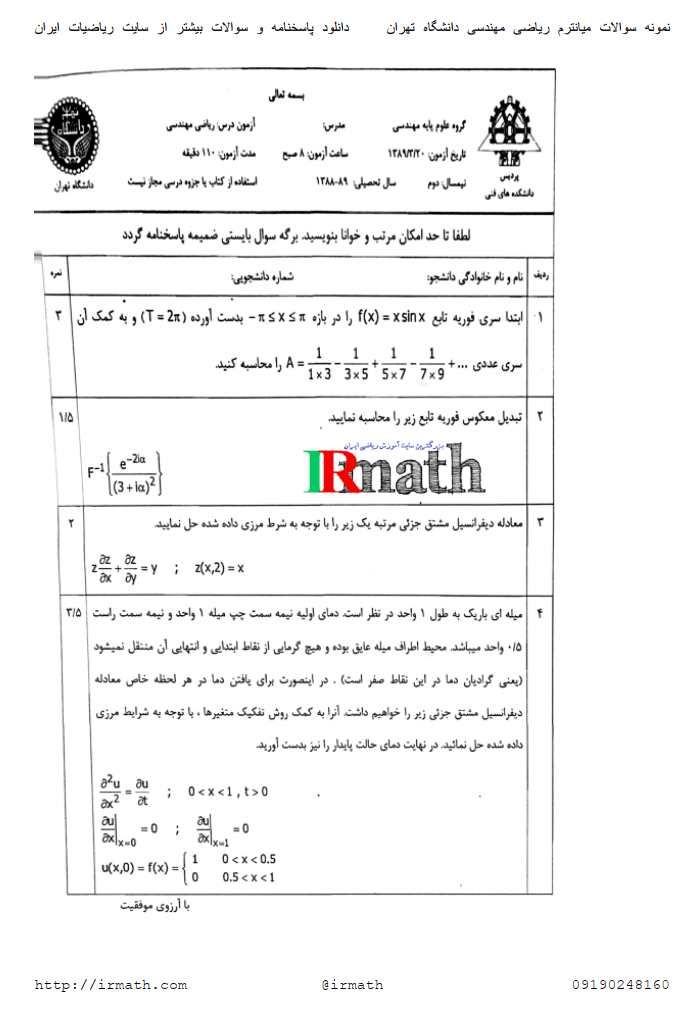 پاسخ تشریحی میانترم ریاضی مهندسی دانشگاه تهران ۱۳۸۹۰۳۲۰