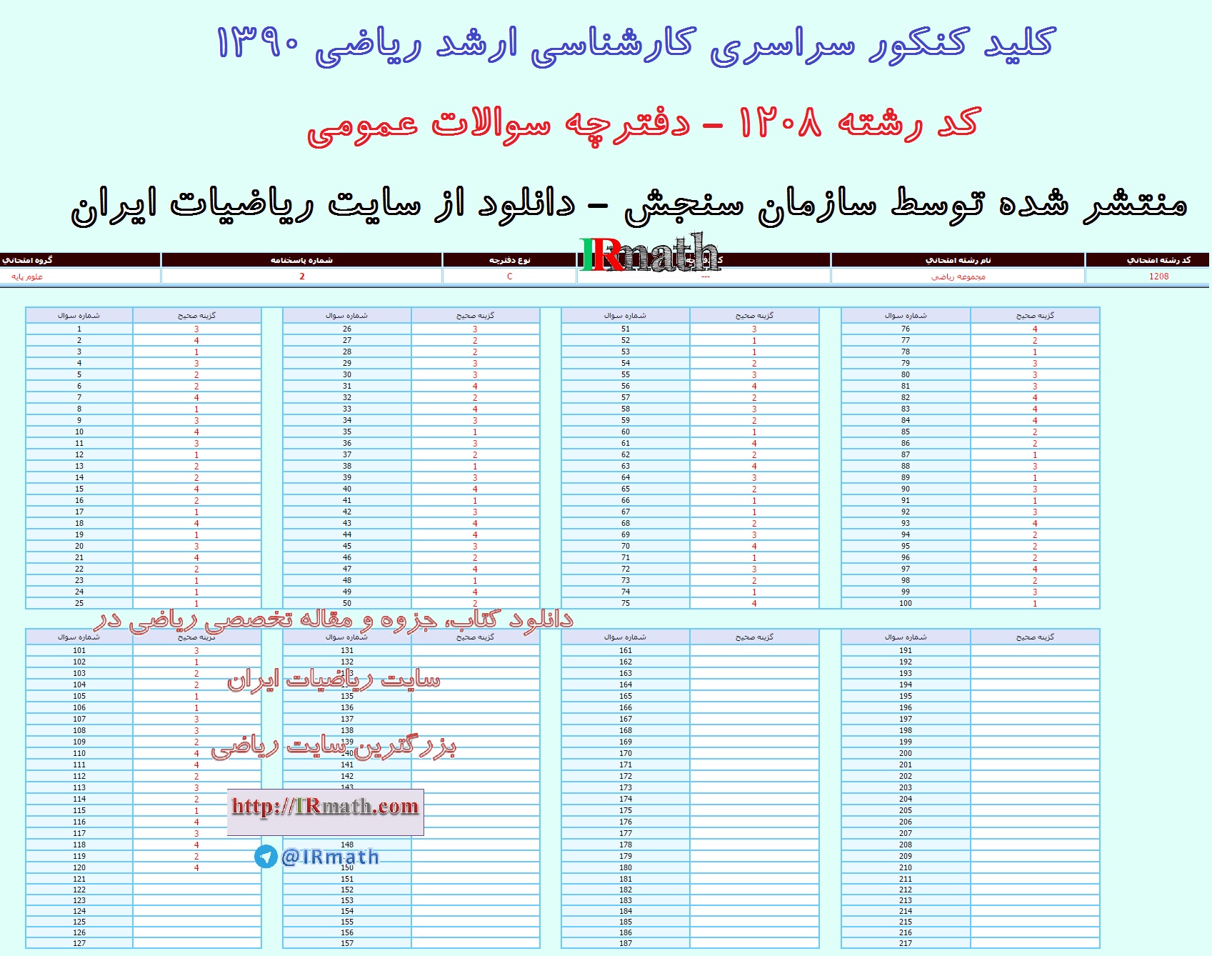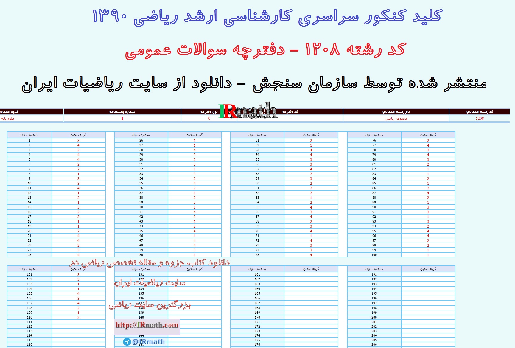 کنکور کارشناسی ارشد ریاضی کد 1208 سال 1390 به همراه کلید سوالات
